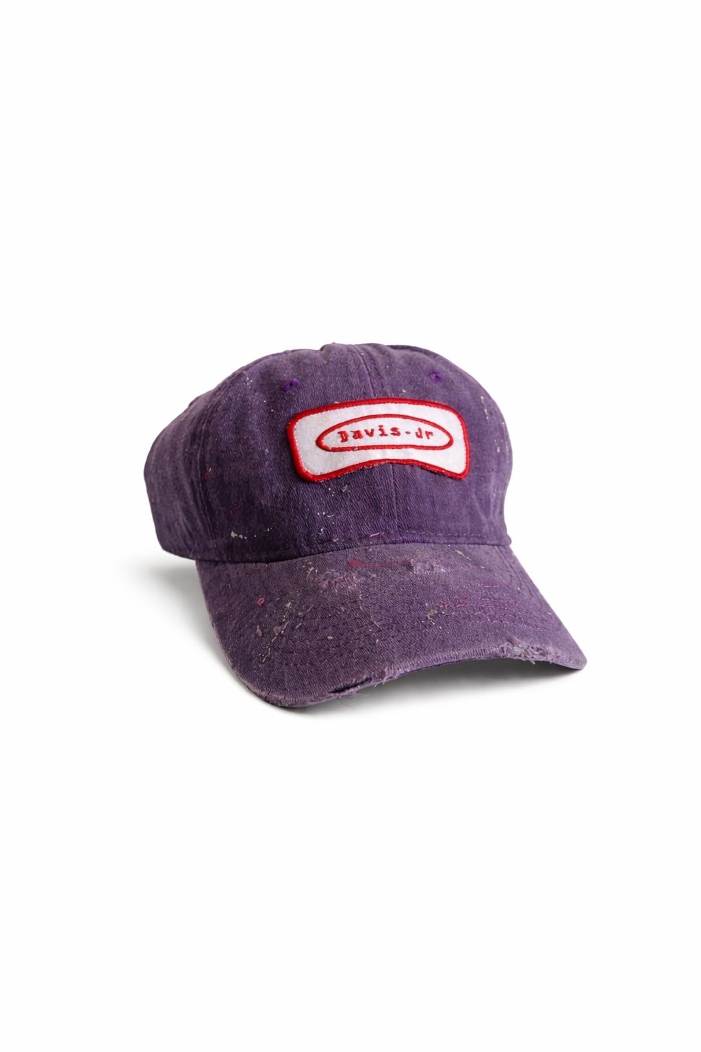 Purple adjustable cap with red patch. Distressed and raw finish.