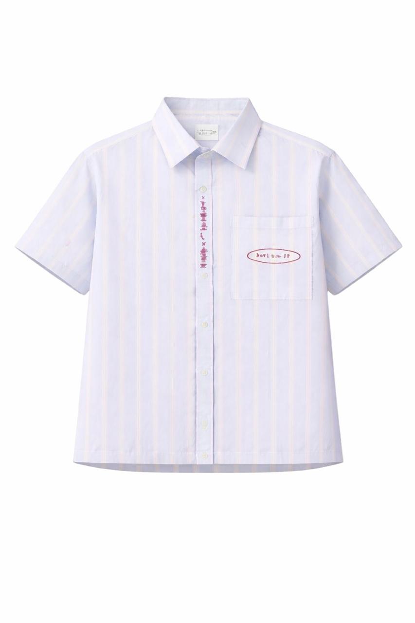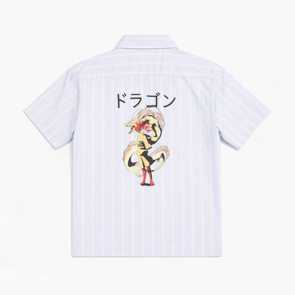 Customised hand embroidery blue stripe cotton anime shirt in box fit. Made with 100% cotton.